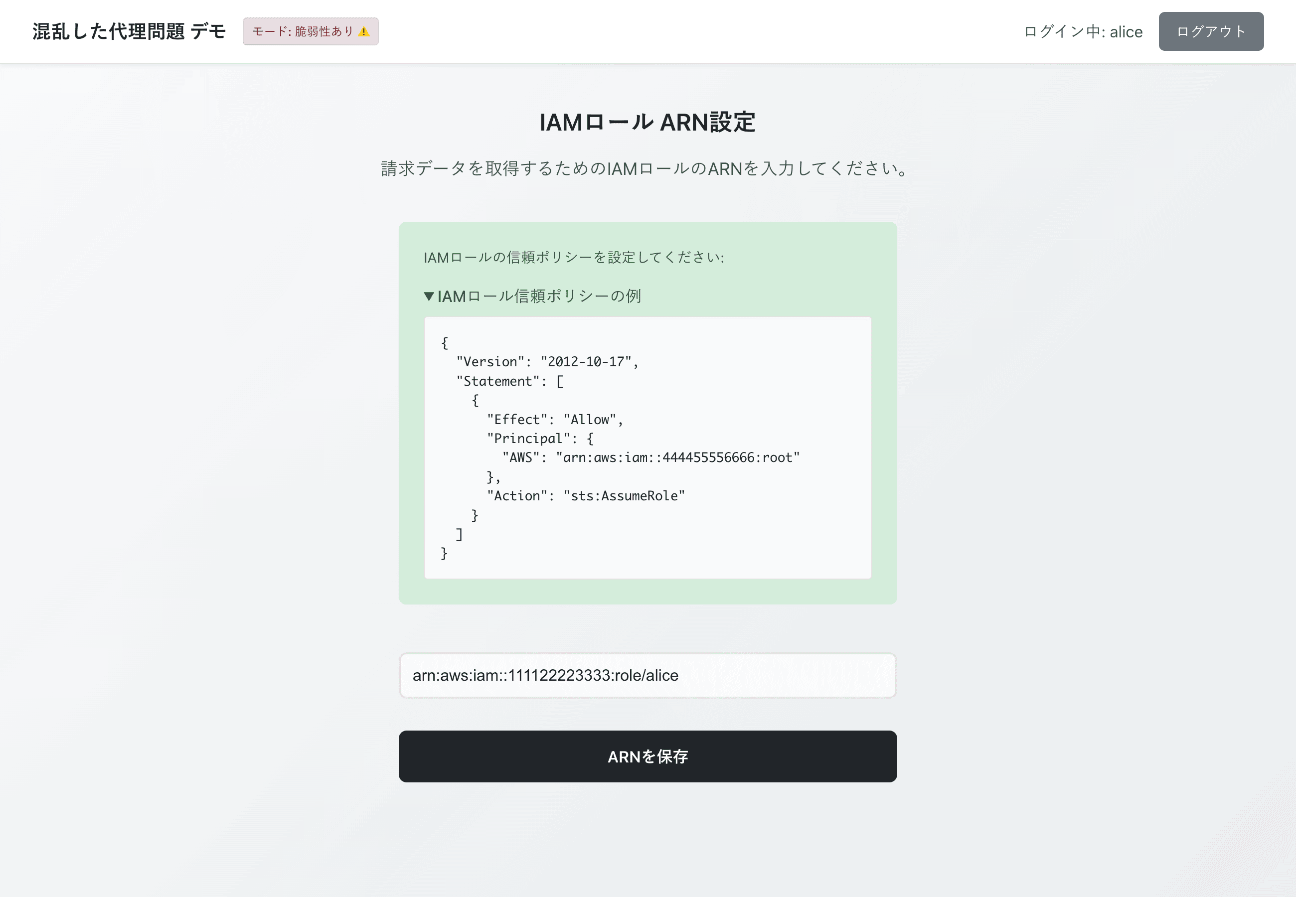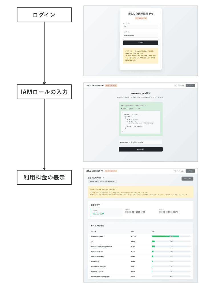 AWS における混乱した代理問題について、脆弱性を抱えたデモアプリケーションを用いてクロスアカウントで権限委任するシナリオを実演し、攻撃がどのように成立するかを体験しました。