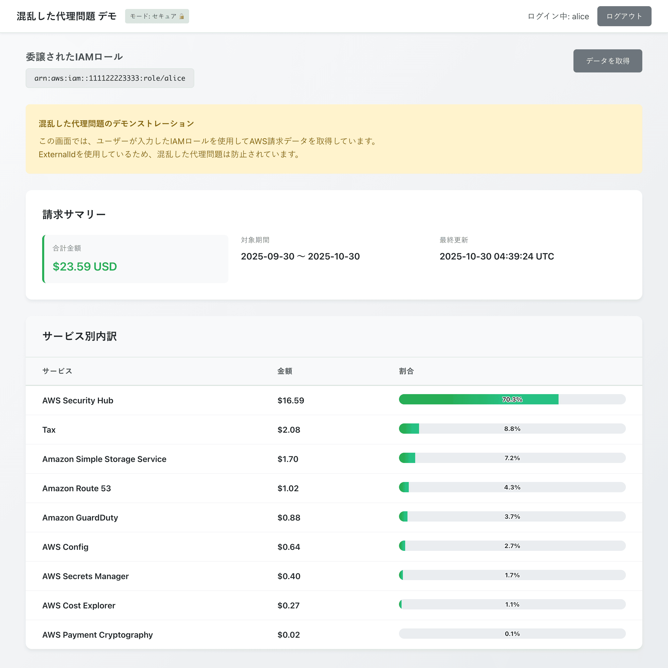 「ユーザから IAMロールを預かって、AWS の利用料金を取得&表示する」という架空の SaaS を考えます。