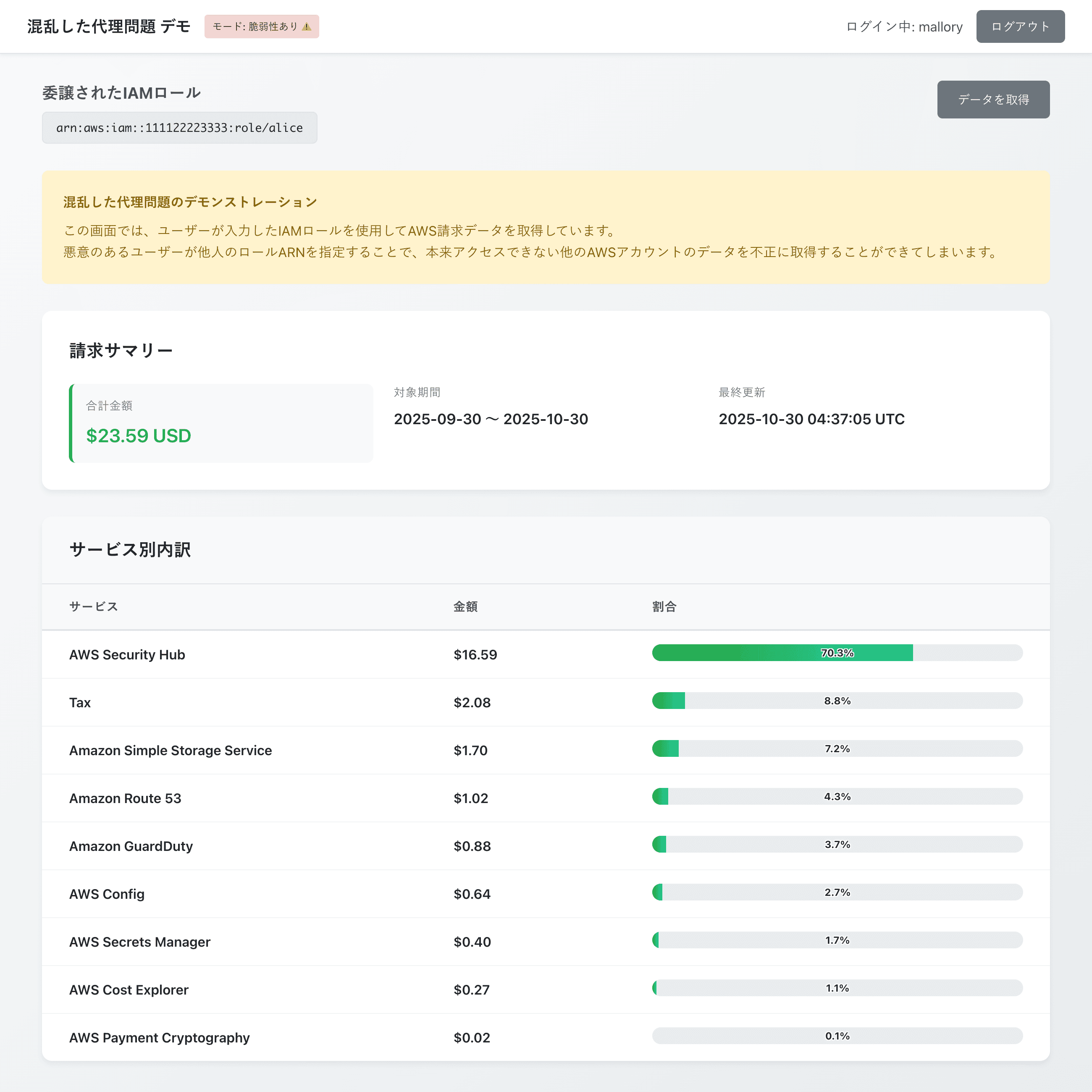 すると、攻撃は成功し、有栖川さんの AWSアカウントの利用料金 が表示されてしまいました。