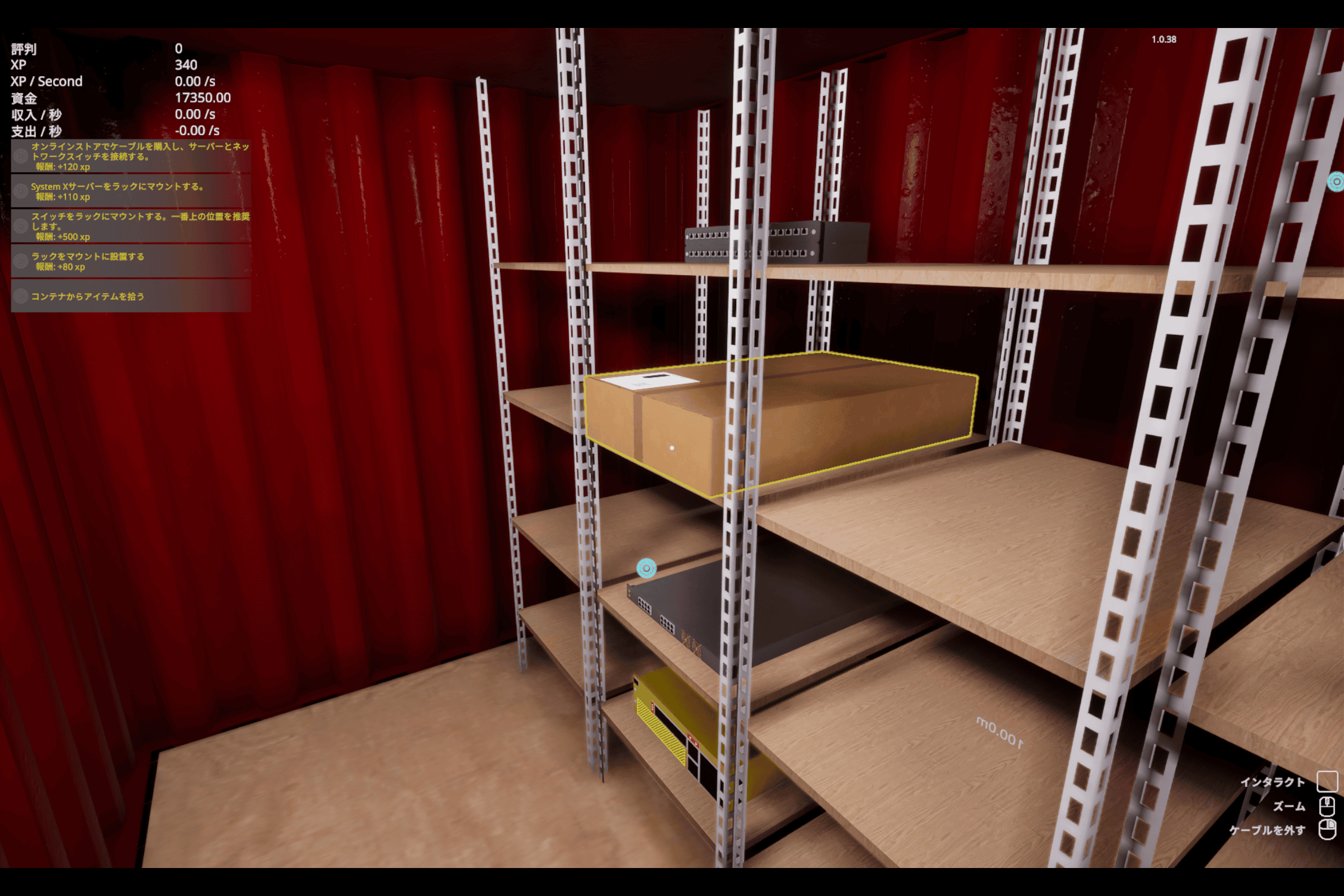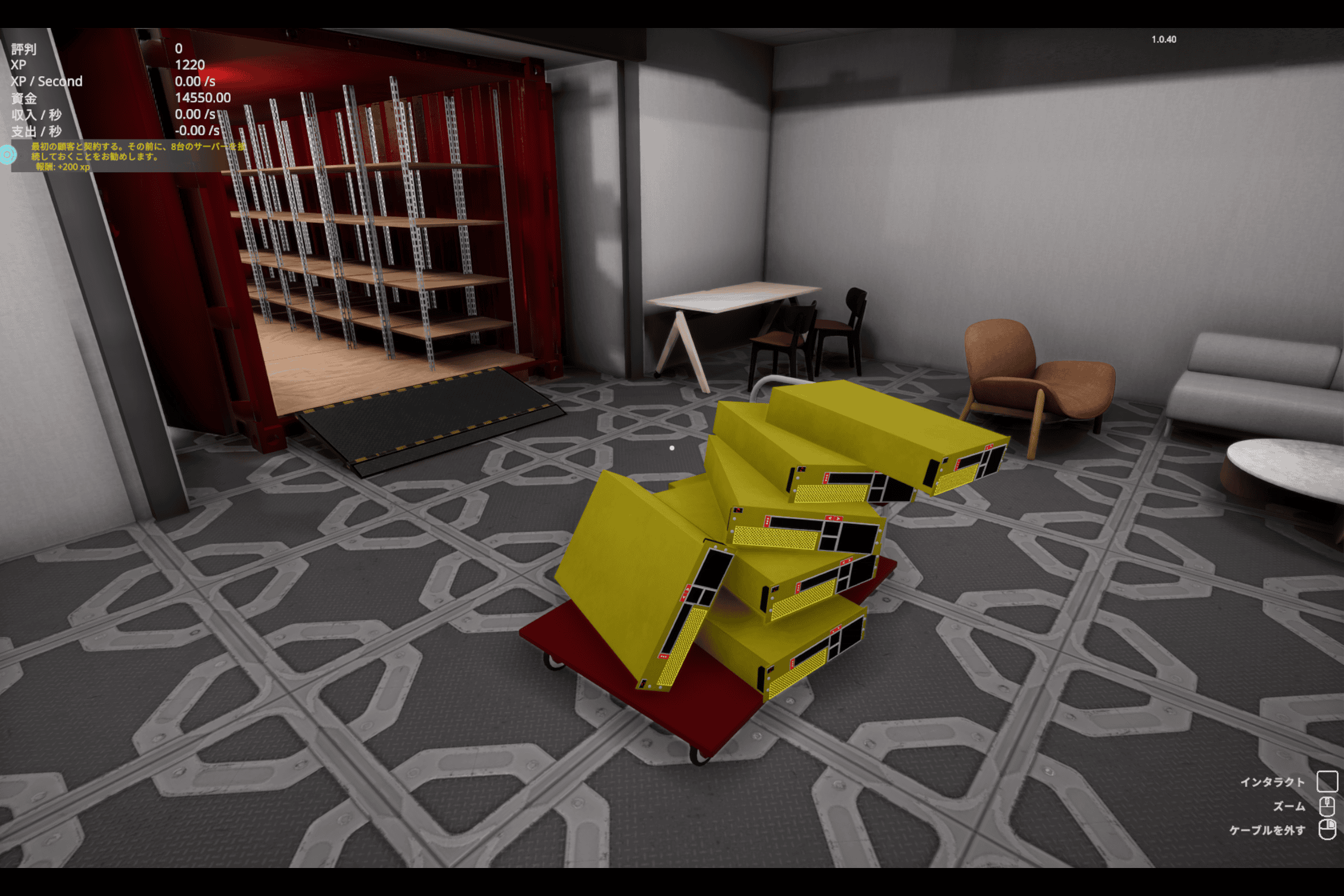 倉庫の棚に購入した商品が積まれているので、これをサーバールームに運搬&設置します。