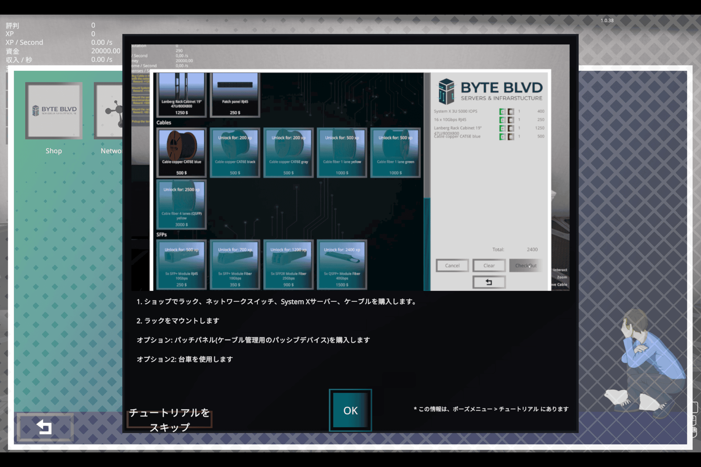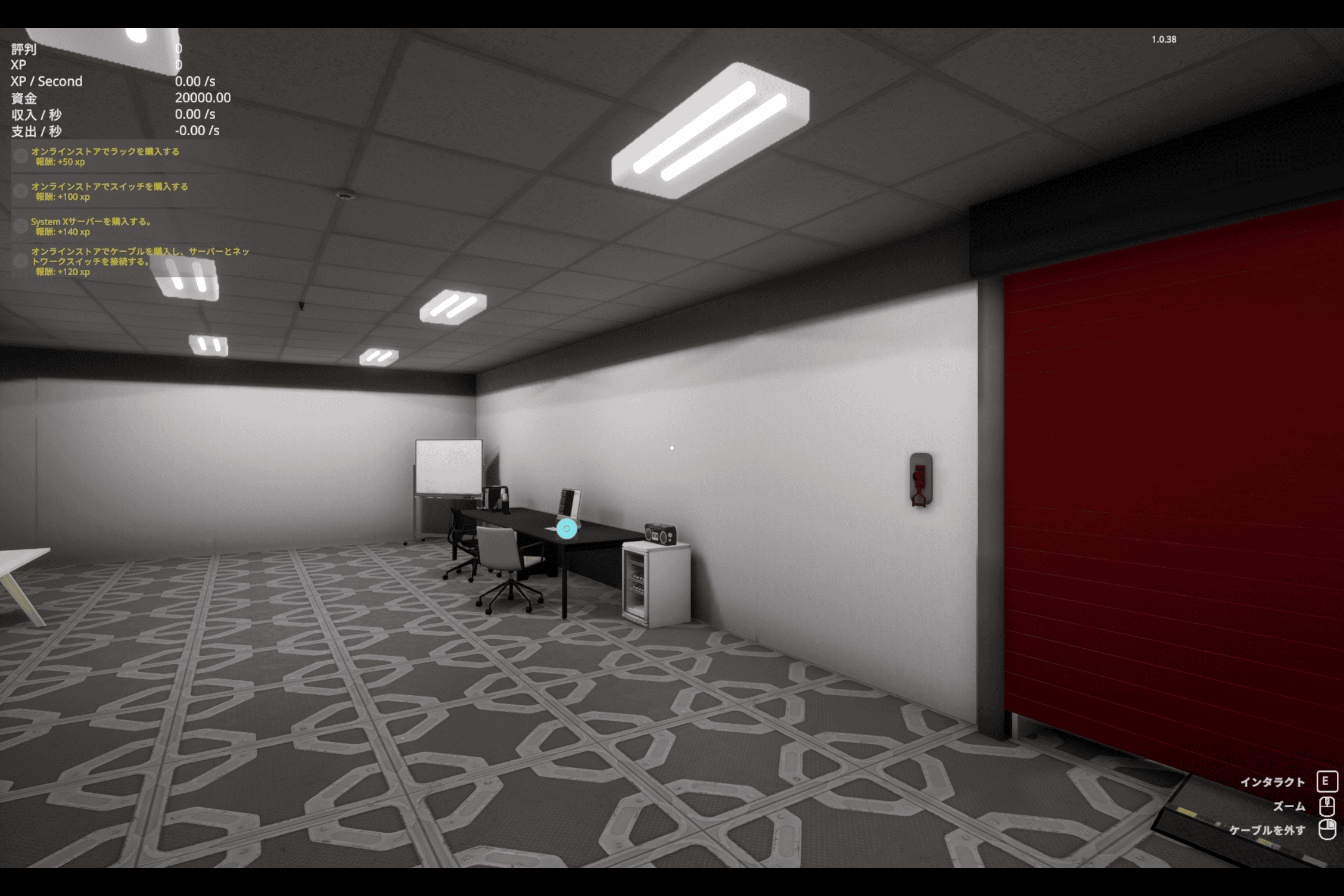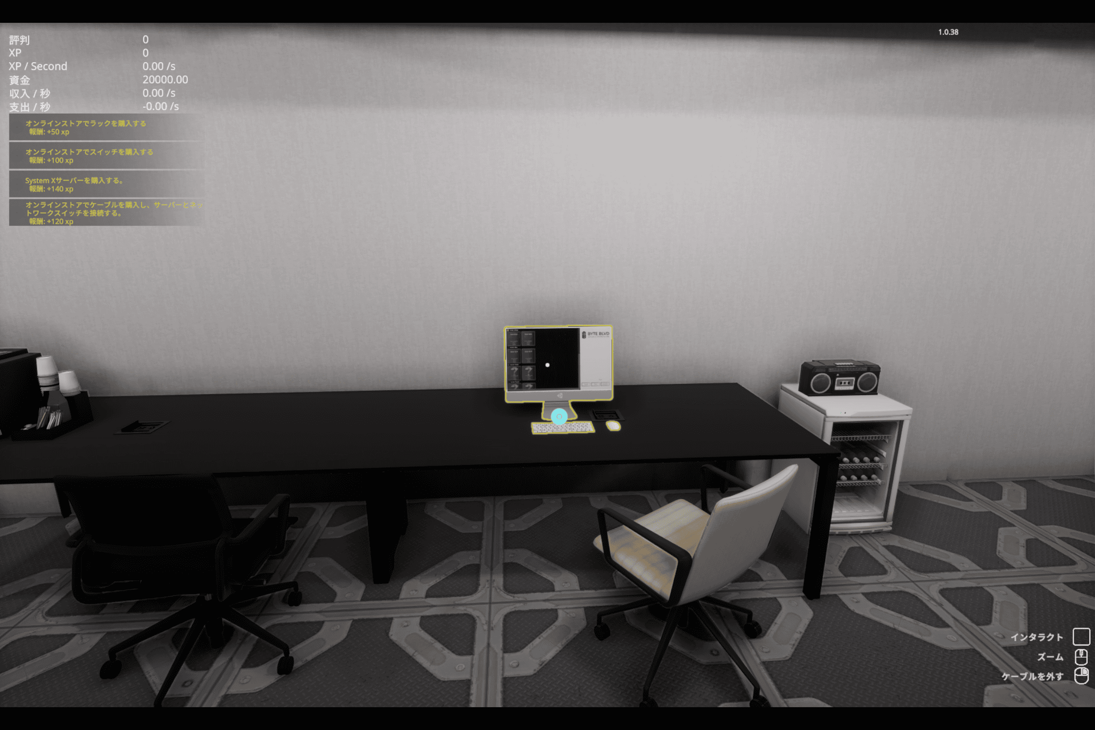 デスクに設置された PC にフォーカスを当てて、メニューから “Shop” を開くとチュートリアルが表示されます。