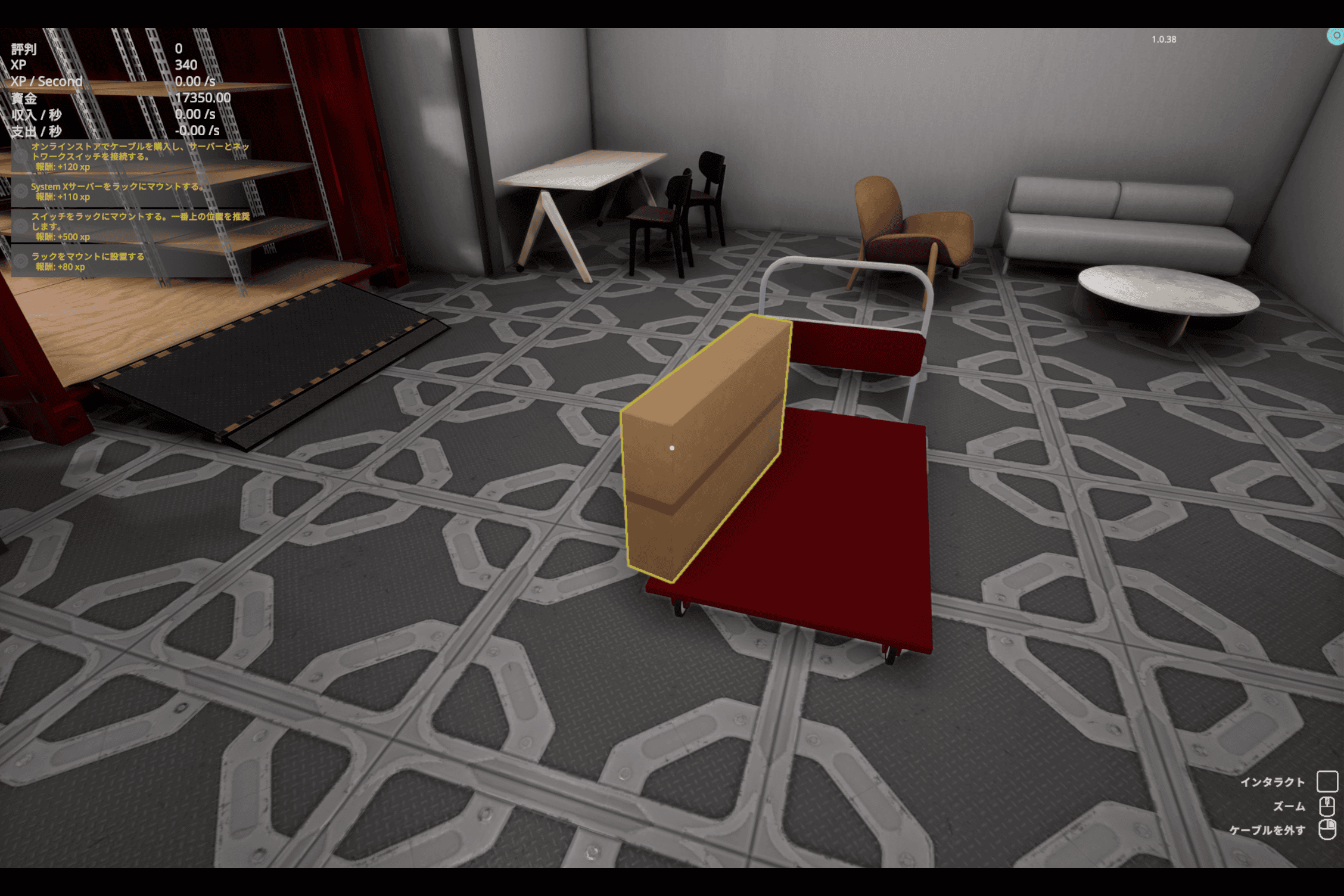 画面の左上に、現在資金などのステータスと次のミッションが表示されています。